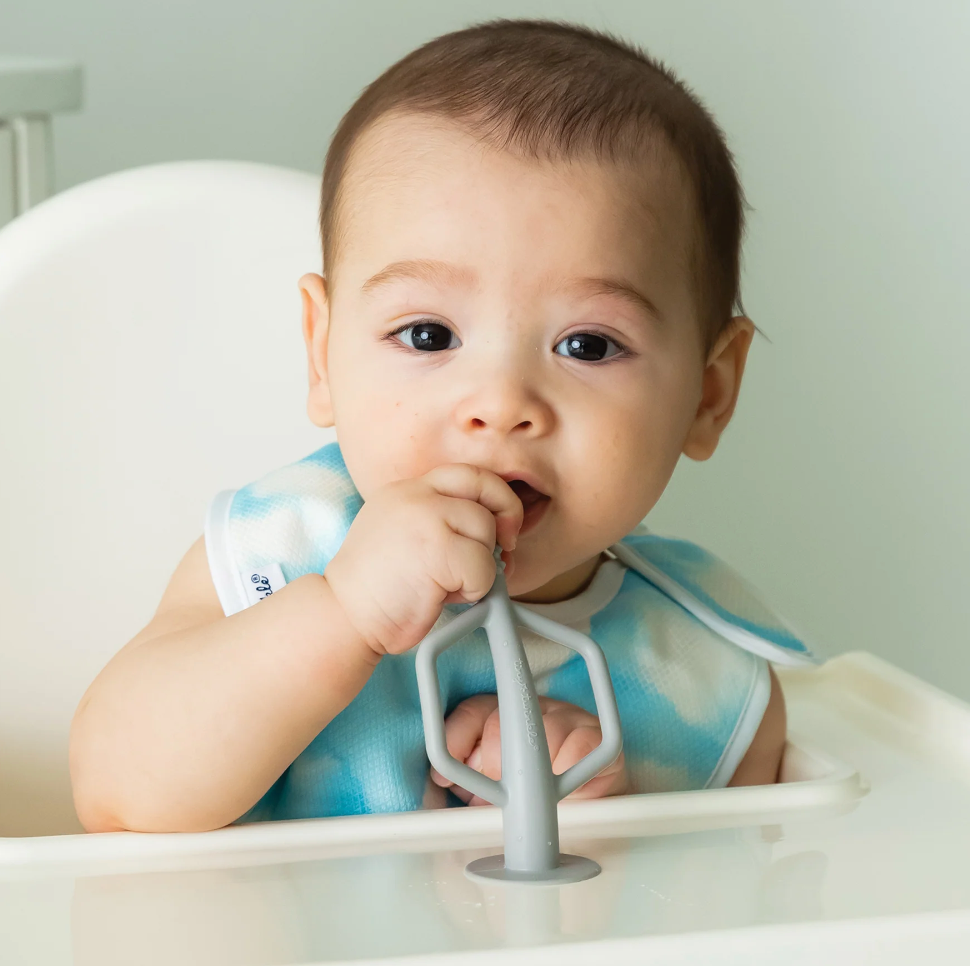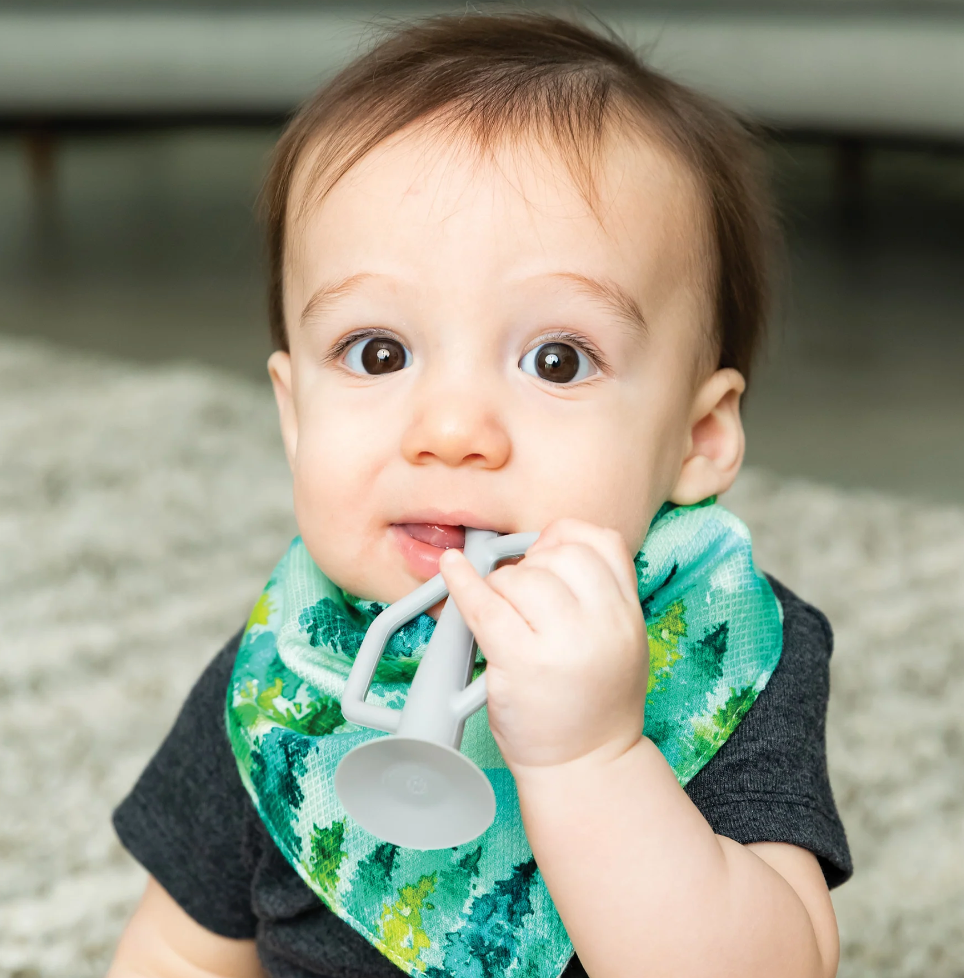 Tiny Twinkle's Silicone Training Toothbrush 2-Pack is the perfect way to encourage early dental hygiene! Made from 100% food grade silicone, the Training Toothbrush is both durable and soft on baby's gums. Featuring multiple textures to massage and stimulate baby's gums, the toothbrush also has soft and gentle bristles to help clean new baby teeth. Easy to grip handles make using the toothbrushes simple for little ones. Suction base keeps the toothbrush upright and away from germs. Dishwasher and freezer safe. For ages 6 months and up.