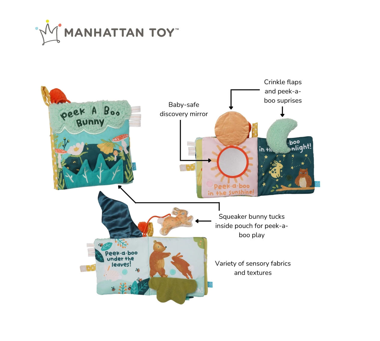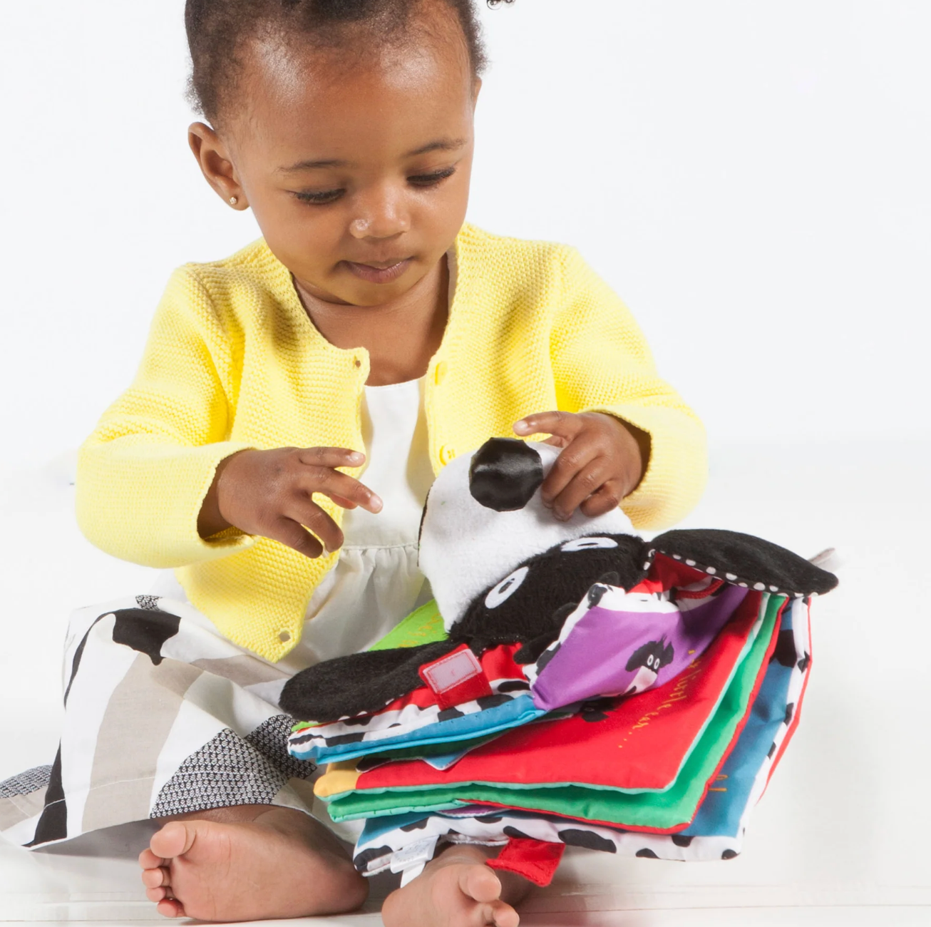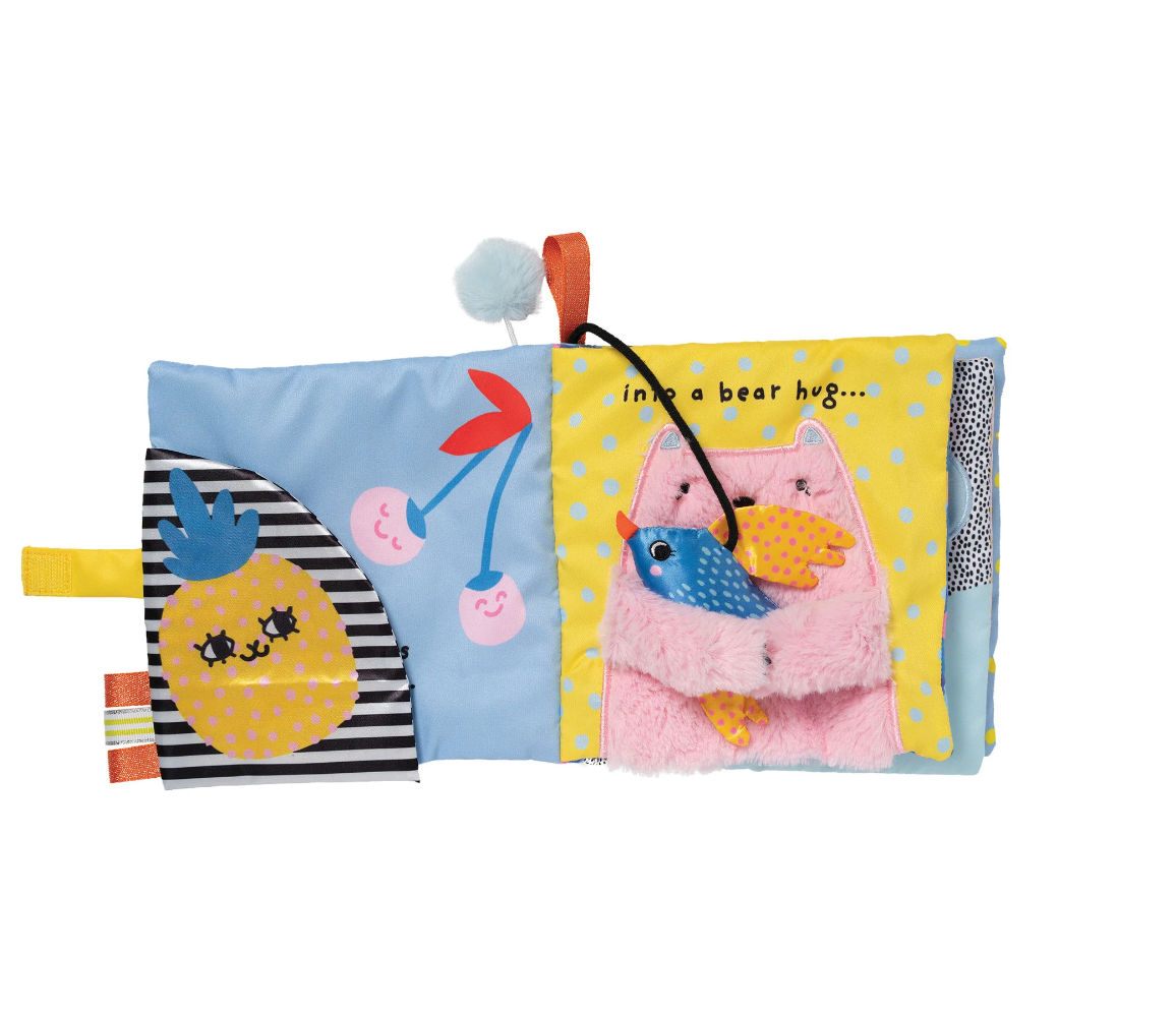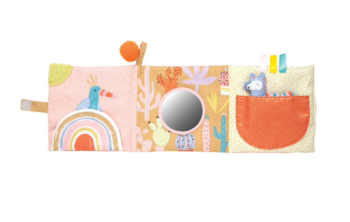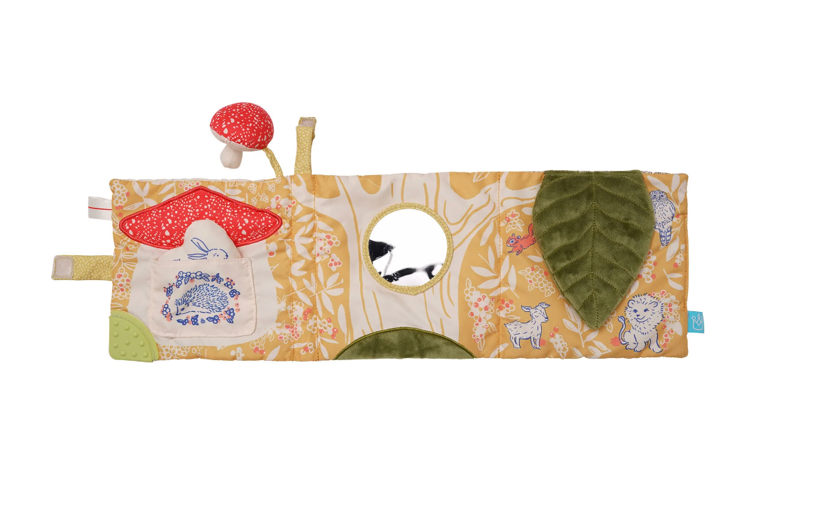Soft textured fabrics for tummy-time play. The soft activity book folds out flat as a pat-mat for tummy-time. Each page features nostalgic illustrations, various fabric textures and playful surprises. A fabric closure keeps pages neat when playtime is over. Activities include peek-a-boo crinkle leaf, textured teether corner, baby-safe discovery mirror, a tethered on squeaker and crinkle accessories. Fabric loop allows for attachment to baby links, carriers, strollers and more. Encourages tummy-time play, motor development, sensory stimulation and cause and effect learning.