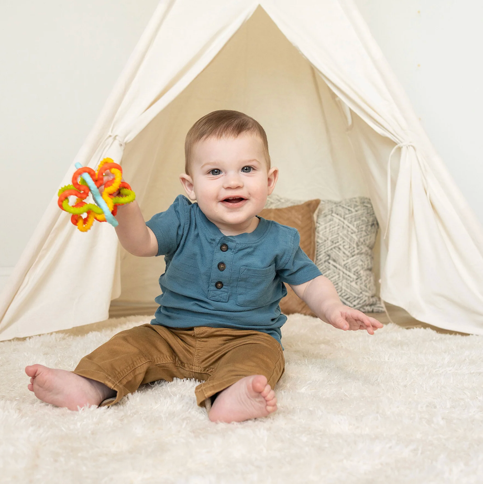 100% silicone, uniquely shaped and ready for sensory playtime! The Squiggle Loops Sensory Toy has all the makings of a textured teether, and brightly colored fidget toy combined. The flexible silicone loops make it easy to grasp, while the textured nubs add tactile play value. Its compact size makes it ideal for travel and easily attaches to baby links. Plus, it's dishwasher safe for easy cleaning! If you're in search of a toy that delivers on a sensory experience and textured teething exploration, look no further than the Squiggle Loops Sensory Toy.
